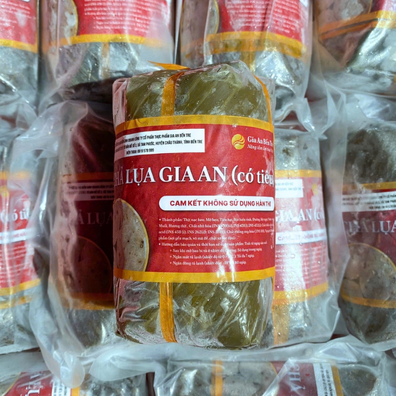 Các đòn Chả Lụa Gia An được gói trong lớp lá chuối xanh thẫm, hút chân không kỹ lưỡng. Nhãn đỏ vàng nổi bật với logo thương hiệu và dòng cam kết “Không hàn the, không phụ gia”. Mỗi khoanh chả khi cắt ra sẽ thấy rõ thớ thịt mịn màng, màu trắng ngà, không rỗ, không bở, tỏa hương thơm nhẹ từ thịt nạc quết nhuyễn và nước mắm ngon cùng những hạt tiêu cay thơm.
